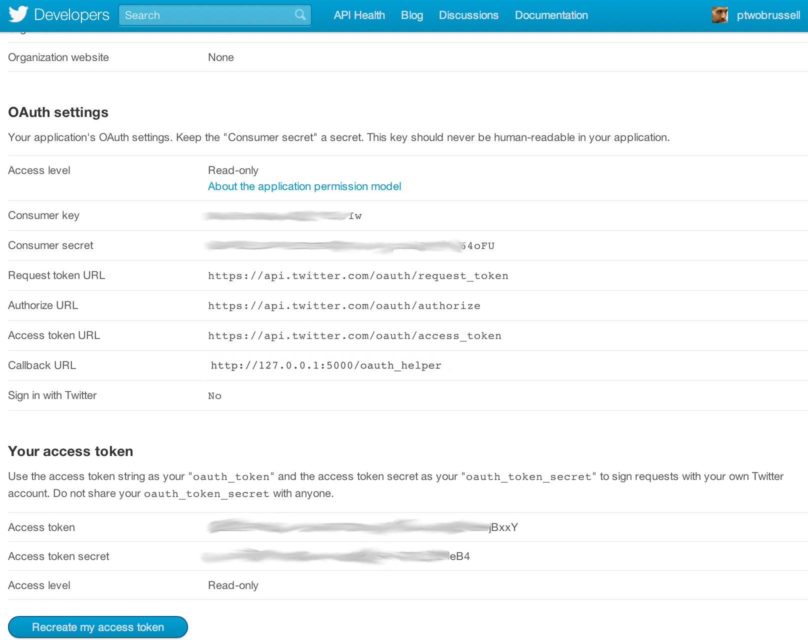 Twitter implements OAuth 1.0A as its standard authentication mechanism, and in order to use it to make requests to Twitter's API, you'll need to go to https://dev.twitter.com/apps and create a sample application. There are three items you'll need to note for an OAuth 1.0A workflow, a consumer key and consumer secret that identify the application as well as the oauth_callback URL that tells Twitter where redirect back to after the user has authorized the application. Note that you will need an ordinary Twitter account in order to login, create an app, and get these credentials. Keep in mind that for development purposes or for accessing your own account's data, you can simply use the oauth token and oauth token secret that are provided in your appliation settings to authenticate as opposed to going through the steps here. The process of obtaining an the oauth token and oauth token secret is fairly straight forward (especially with the help of a good library), but an implementation in IPython Notebook is a bit tricker due to the nature of embedding a web server, capturing information within web server contexts, and handling the various redirects along the way.